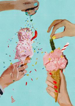 Du bist auf der Suche nach einem Hauch von Freude in deinem Zuhause? Dann ist unser Wandkunstwerk „Spring Chilli and Pickle Icecream“ genau das Richtige für dich. Dieses verspielte Kunstwerk zeigt fröhliche Hände, die Eiswaffeln mit kunterbunten Streuseln und ungewöhnlichen Toppings wie Chili und Essiggurken dekorieren. Ein echter Eyecatcher!