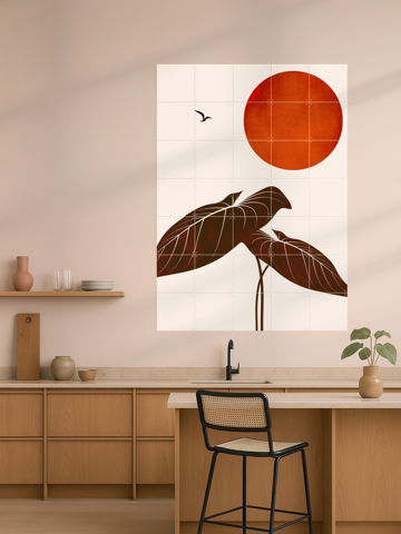 Imagine a cozy corner in your living room, where warm hues of brown and red gently blend with a serene white background. The "Dreaming At Night Rust" wall art piece by Kubistika captures a night scene with a stunning, rust-colored sun and delicate leaves. You’ll love how easy it is to hang this piece—just stick it on with the included adhesive, no nails or tools needed!