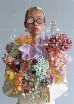 Imagine walking into your living room and being greeted by a burst of color with the "Shades of Petals" artwork by Henriette Visscher. This delightful piece features a woman holding an eclectic bouquet of flowers, each petal bursting with vibrant hues of purple, pink, and yellow. It's like a bouquet that never fades, right there on your wall!