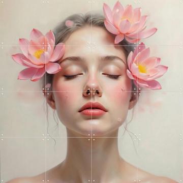 Imagine this: a serene, dreamy scene right in your living room or bedroom. Pink Reverie by IXXI Studio features a beautiful woman with lotus flowers framing her face. It’s like a soft whisper of calm and beauty.