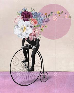 Imagine a whimsical scene right in your living room: a vintage biker with a bouquet of flowers on his head, riding a high-wheeled bicycle. This playful "Spring Bikerides" by Marja van den Hurk brings a splash of color and fun to any space.