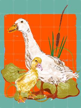 Imagine a cozy spot in your home where a touch of playful charm awaits. The "Peking Ducks Pond" by Marylène Madou brings just that. Picture a mother duck and her chick, both in bright yellow, set against an orange background with serene lily pads. It’s like a mini-adventure in your living room or a sweet touch in your hallway. You’ll love how easy it is to hang – no nails or tools needed, just stick and go! Printed on demand and made in the Netherlands, it’s also eco-friendly and safe for your space. Add a splash of color and fun to your walls with this delightful duo.