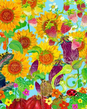 Imagine your living room with a burst of vibrant colors every time you walk in. The "Vegetable Garden Blue" by Marylène Madou brings this dream to life. With sunflowers, strawberries, and eggplants dancing across the canvas, it’s like a cheerful garden party on your wall. The artwork's playful and colorful design will surely brighten up any space, especially your living room or kitchen.